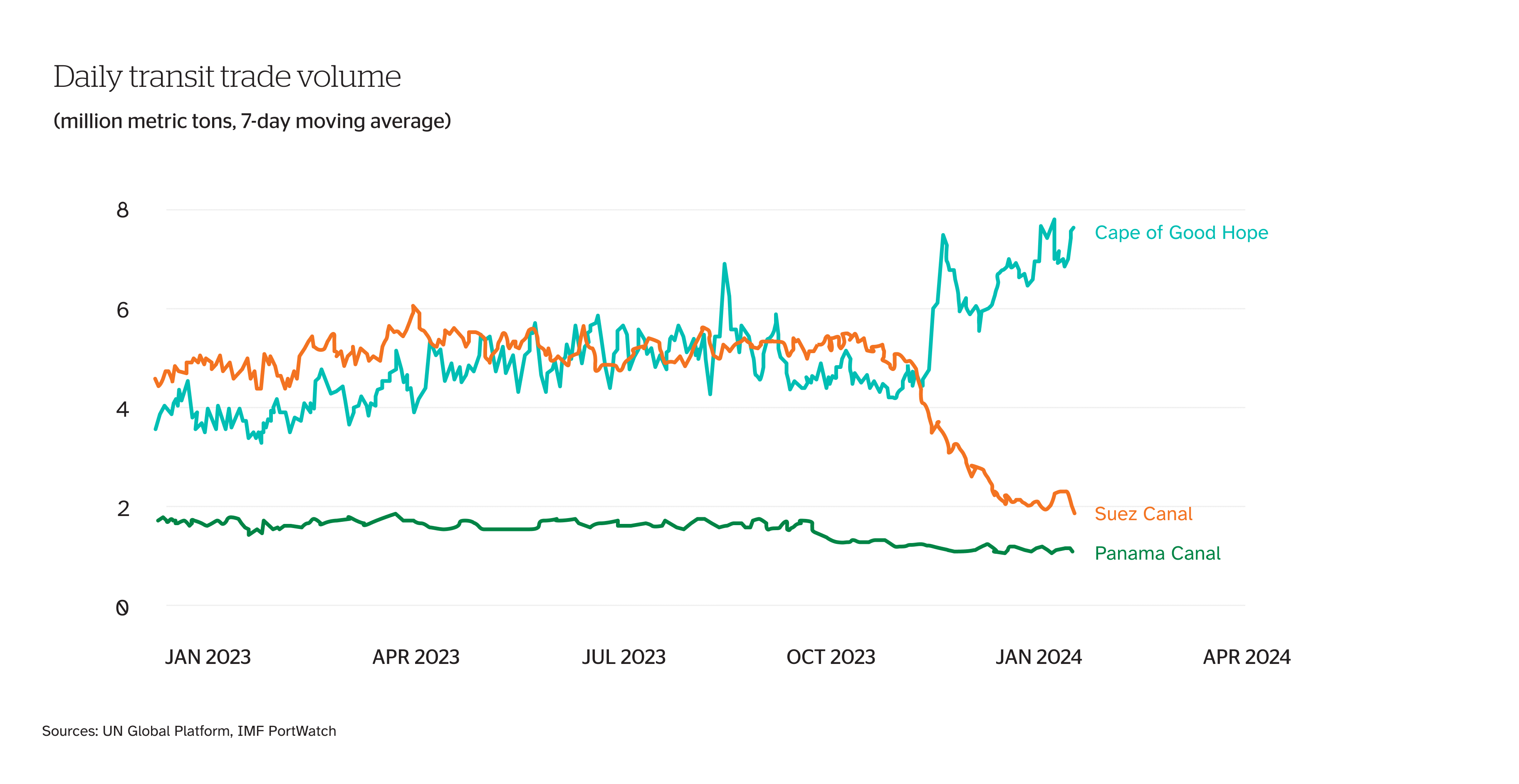 The closure of the Red Sea forced many vessels to bypass the Suez Canal and divert around the Cape of Good Hope, adding two to three weeks to their voyages^. The war in Ukraine and wider unrest in the Middle East have further disrupted traditional corridors.